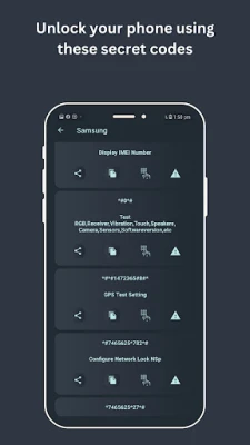 You can type the code manually or you have the option to copy the code by pressing the copy button. If you find some code most useful for you and want to share with someone the Mobile secret codes application allows you to share the code by just one simple click.