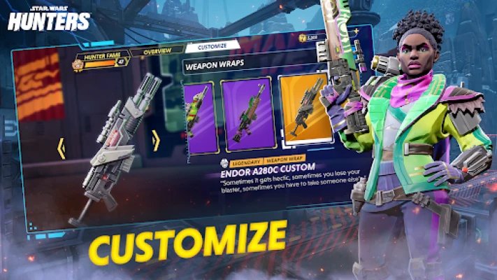 Located deep in the Outer Rim on Vespaara, and under the eye of the Hutt command ship, the competitions in the Arena evoke stories of the battles that have defined galactic history and are inspiring a new era of combat entertainment. Star Wars: Hunters is a thrilling, free-to-play action game featuring new, authentic characters engaged in epic battles. New Hunters, weapon wraps, maps, and additional content will be released every Season.